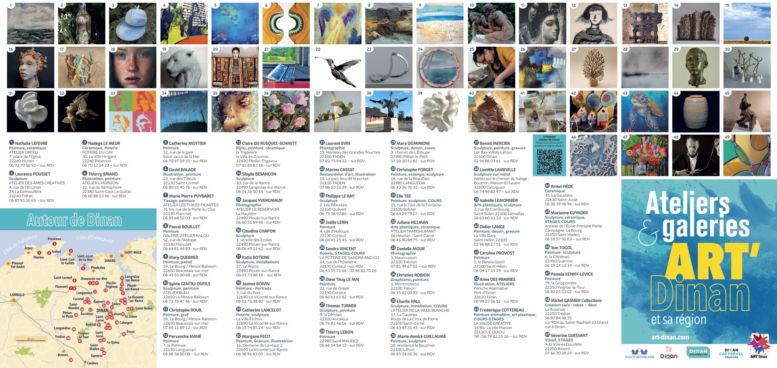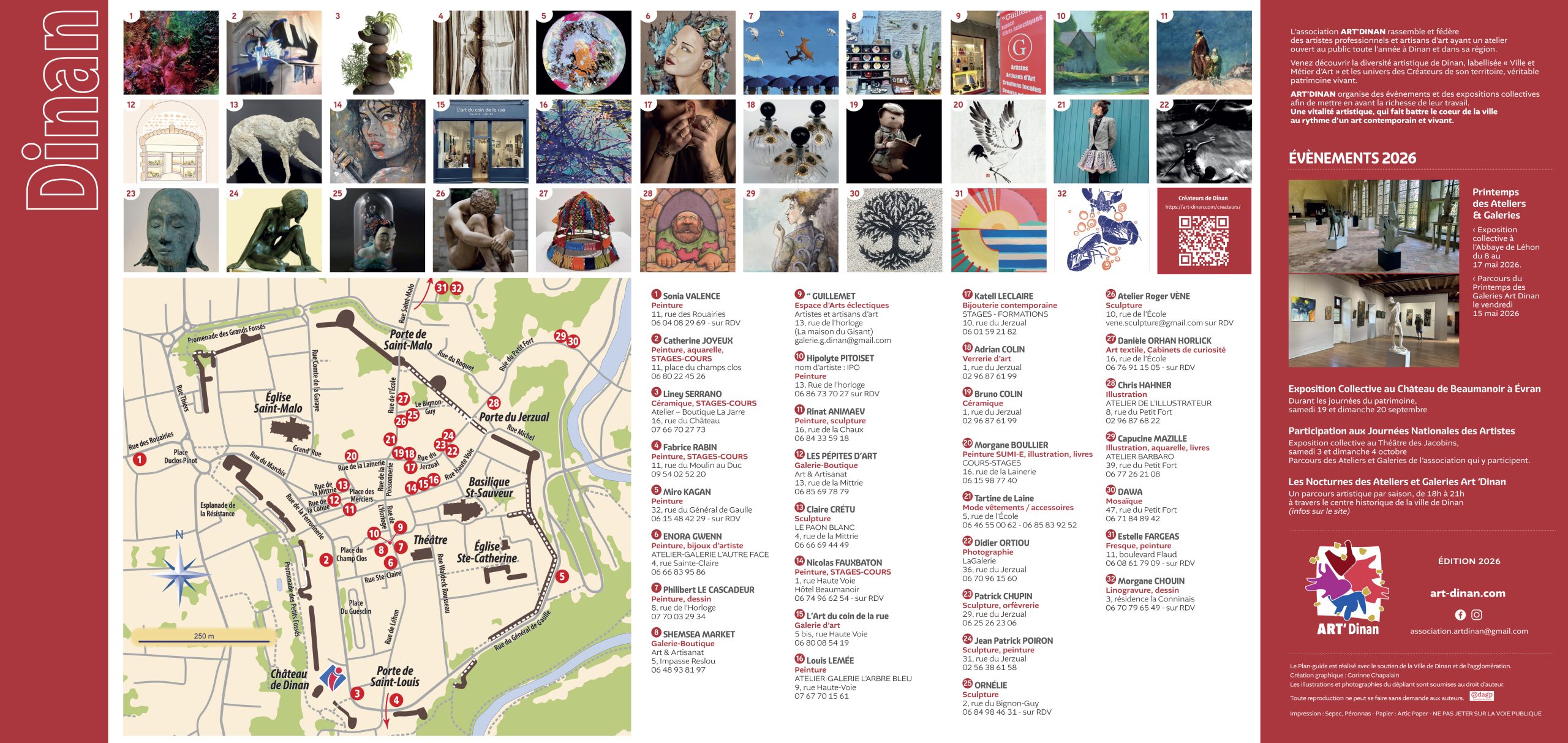 En partenariat avec la Ville de Dinan et de Dinan Agglomération l’association publie un plan-guide Art’Dinan offrant un parcours signalant les emplacements des ateliers des uns et des autres, à Dinan et ailleurs dans la région. Ce dépliant est à votre disposition à l’Office de Tourisme, la mairie et dans les ateliers et galeries. Le plan-guide 2026 est également téléchargeable ici.